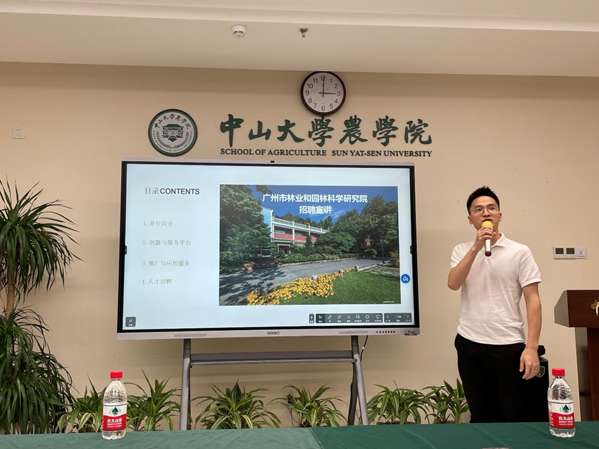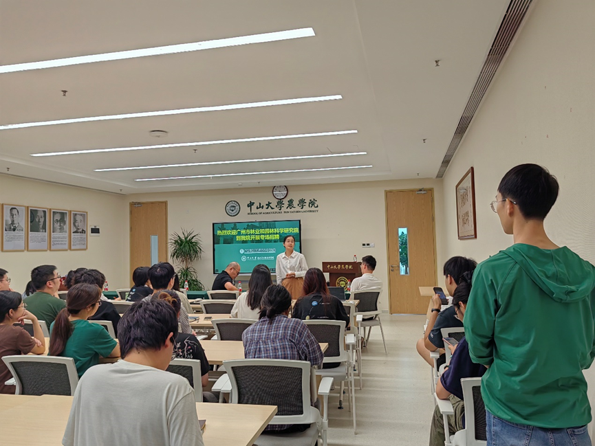 随后,研究院朱部长介绍了广州市林业和园林科学研究院及下属重要创新与服务平台的基本情况,并对研究院近期几个典型的推广应用服务案例进行了回顾与展望。接着,朱部长重点介绍了本次招聘的岗位类型、专业要求、相关人才政策、薪资待遇、职业发展通道、工作文化氛围等。他表示,研究院现在正处于关键的发展阶段,人才需求旺盛,期待中山大学优秀的毕业生加盟,共同投身林业园林科技创新事业,助力广州谱写高质量发展新篇章。