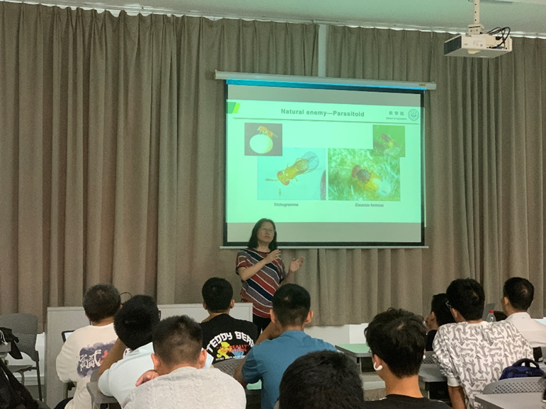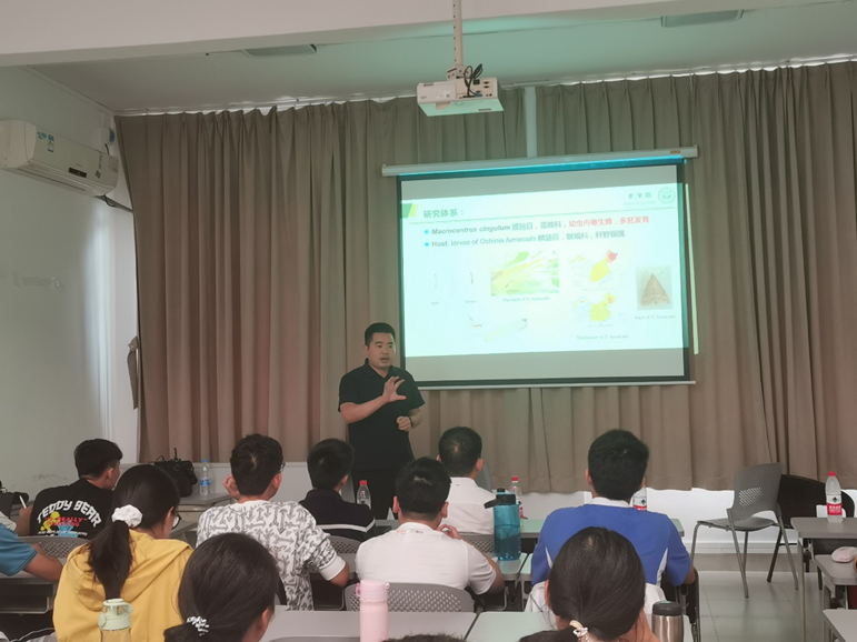 胡建老师首先介绍了有害生物绿色防控团队教师成员,随后依次从目前害虫防治的现状,农药在害虫控制上近期产生的问题,害虫产生的抗药性的危害,害虫会带来的巨大经济损失等方面,阐明害虫防治工作的重要性。为启发同学们对利用天敌开展害虫绿色防控科研领域的了解,胡老师就寄生蜂与寄主的免疫互作、寄生蜂调控寄主发育的分子机制、寄生蜂与寄生的基因组学、稻田寄生性天敌的多样性及保护等知识,为同学们做了深入浅出的介绍,引导同学们思考怎样解决杀虫剂使用与粮食安全保障之间的关系,如何在自然中寻求方法开展害虫防治。
