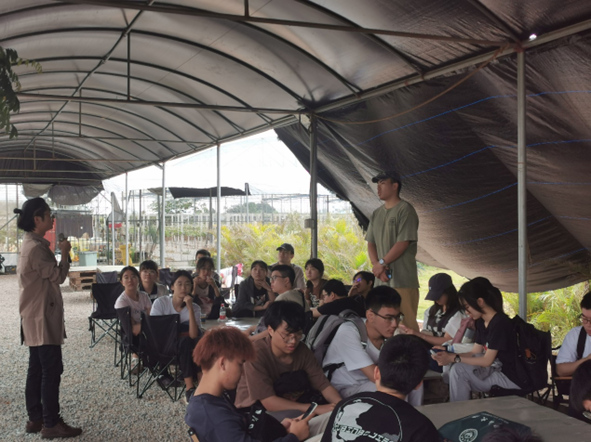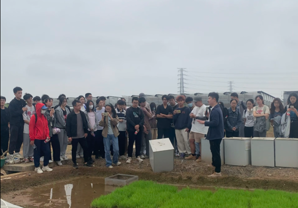 接着,彭宇涛老师带领同学到三水科技小院的试验田。郝师兄和彭宇涛老师向同学们介绍了有关低碳排放植物的专业知识,如筛选低碳植物、生物碳入地及固定的双途径,同时也强调了农学专业学生在实验田里开展实验的重要性与必要性,积极呼吁同学们将课本上学到的知识用之于实践,培养良好的实践能力。同学们听完介绍后积极提问,收获颇丰。