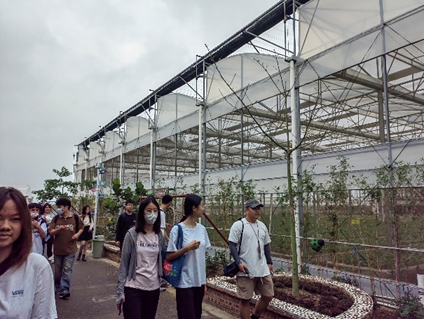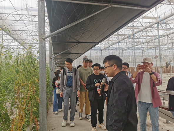 师生交流环节结束后,三水科技小院研究团队带领学院师生在三水科技小院产业园进行实地学习。首先参观蔬菜种植大棚。在这里,研究生郝勇州学长给同学们详细介绍了有关蔬菜种植的专业知识,同学们看到规模庞大、管理有序的蔬菜大棚,长势茁壮的青菜、西红柿以及三水科技小院特色黑皮冬瓜,积极踊跃向老师及同行的研究生学长学姐提问,了解了蔬菜大棚的工作原理,以及大棚的种植的优势。