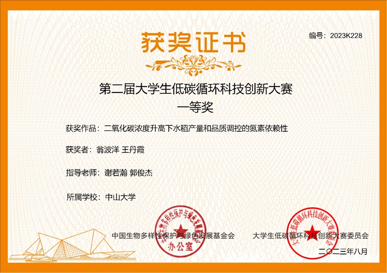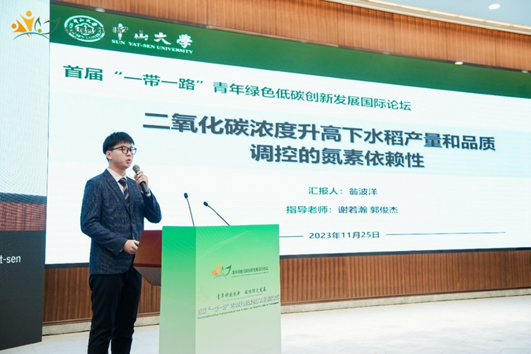 作为中山大学农学院学生代表,翁波洋以《二氧化碳浓度升高下水稻产量和品质调控的氮素依赖性》为主题,介绍了施用氮素改善了二氧化碳浓度升高造成水稻品质下降的相关研究,探讨了在“双碳”背景下,保障国家粮食安全的问题,展示了绿色低碳发展理念下农学学子的研究新方向,促进了绿色低碳创新发展过程中各项成果经验交流。