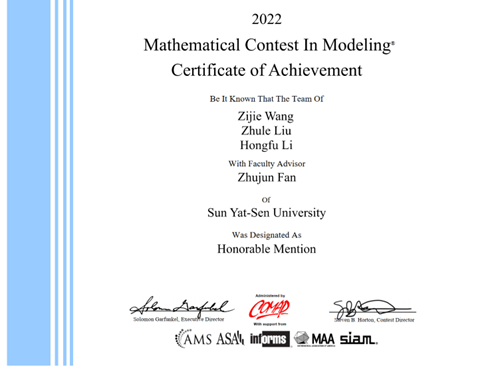 5月6日,2022年美国大学生数学建模竞赛成绩公布,我院代表队荣获Honorable Mention奖次,该战队由2020级本科生王梓杰、李泓甫以及2021级本科生刘铸乐组成。 三位同学在2月18日至22日四天时间内,就指定的问题完成从建立模型、求解、验证到英文论文撰写的全部工作,充分体现了农学院本科学子研究问题、解决方案的能力及团队合作精神。