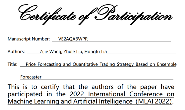 同时,在农学院魏蜜、史俊鹏老师的学术指导下,队员们在赛后将参赛论文进行修改和完善,并以Price Forecasting and Quantitative Trading Strategy Based on Ensemble Forecaster为题在2022年机器学习与人工智能国际学术会议(MLAI 2022)上发表。MLAI由科威特大学和同济大学支持承办,中山大学人工智能学院副院长印鉴教授为大会主席,于2022年4月22-24日召开,农学院数学建模队伍成员以论文作者的身份参加该会议。