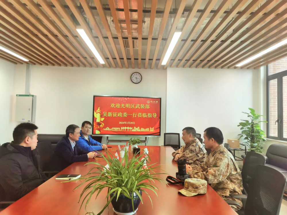 1月29日上午,深圳市光明区武装部吴新征政委一行走访我院,慰问我院高层次人才肖仕院长,送上区委区政府对人才发展的关心和对学院发展的支持。学院分工会主席朱冠恒、副主席彭宇涛,团委书记陈素玲等接待了到访一行。