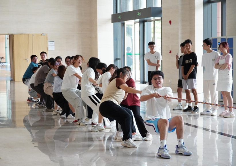 趣味运动项目赛共有6支队伍报名参与,依次进行的是传统趣味项目—拔河、集体跳绳和“五人六足”竞走。队员们在拔河比赛中展现了顽强的合作精神,在集体跳绳中呈现出活力与节奏感,而在“五人六足”竞走中考验了团队的默契和协调性。