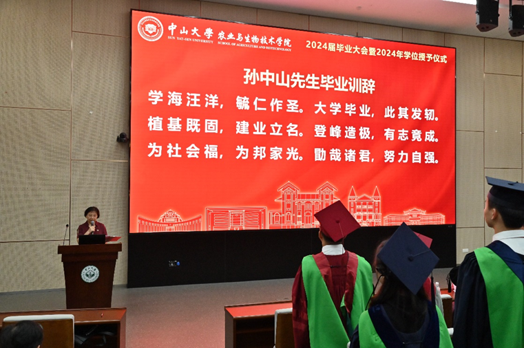 接着,全体毕业生在程月华书记的带领下,重温了孙中山先生毕业训辞:“学海汪洋,毓仁作圣,大学毕业,此其发轫。植基既固,建业立名,登峰造极,有志竟成。为社会福,为邦家光,勖哉诸君,努力自强”。历经百年岁月的毕业训辞,寄托了孙中山先生对中大学子的殷切期盼。全体毕业生怀着对中大精神的深刻体悟和坚定传承,整齐划一、铿锵有力地回应“谨遵教诲”。