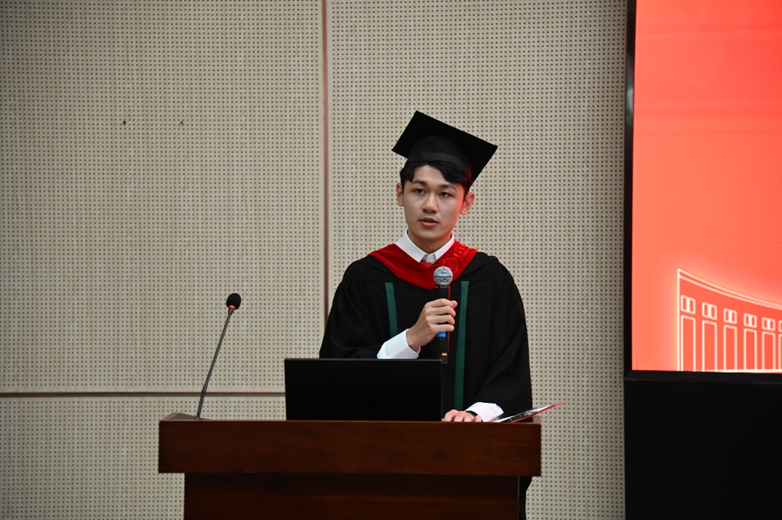 硕士毕业生代表2021级范舒婷同学分享了三年学习和科研道路上的难忘记忆,总结道:在克服一个又一个困难的过程中,我们学会了从思考中确立方向,从学习中提炼创新,从计划中把握时间,从实践中探索真理。她希望大家将在学院求学的这段时光珍藏于心,永远怀揣希望,不惧困阻,坦然面对不确定的难题,享受攻克难题的充实感和成就感,书写自己闪光的时代答卷。