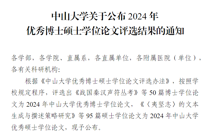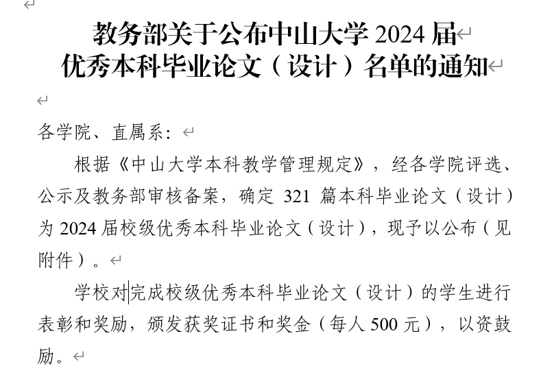 近日,我校研究生院、教务部分别公布了《中山大学关于公布2024年优秀博士硕士学位论文评选结果的通知》和《教务部关于公布中山大学2024届优秀本科毕业论文(设计)名单的通知》。我院2021级植物保护专业硕士研究生范舒婷(导师:朱冠恒副教授)的学位论文获评中山大学优秀硕士学位论文,2020级农学专业本科生王梓杰(指导老师:史俊鹏副教授)、代湘杰(指导老师:谢若瀚助理教授)的本科毕业论文获评中山大学2024届优秀本科毕业论文(设计)。