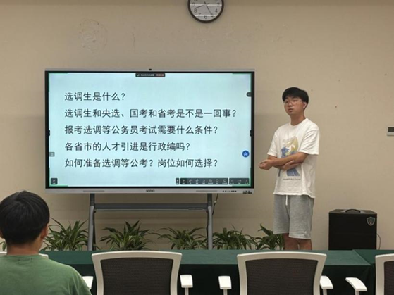 第一位分享嘉宾是2020级毕业研究生邓皓辉同学,他参与两次广东省定向选调生考试,在第二年成功考入省直选调单位——广东省林业局。他就自己两次“选调”的经历,与大家详细分享了选调考试的报考要求、特点、岗位设置,以及针对广东选调的考试内容该如何合理备考,增进了同学们对选调生考试的了解。“遇到挫折不可怕,重要的是调整好心态,朝着一个目标继续努力,继续准备迎接下一个挑战。”邓皓辉同学在首次参加选调考试失利后,总是以这样的话激励自己。他把这句话同样分享给在座同学,希望大家都能找到前进的方向,不要因为失败而畏缩。