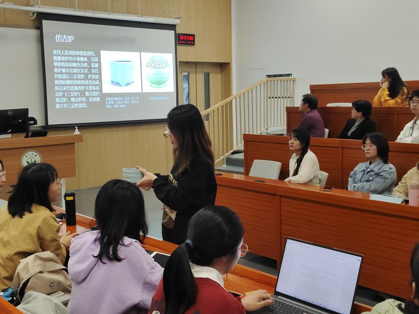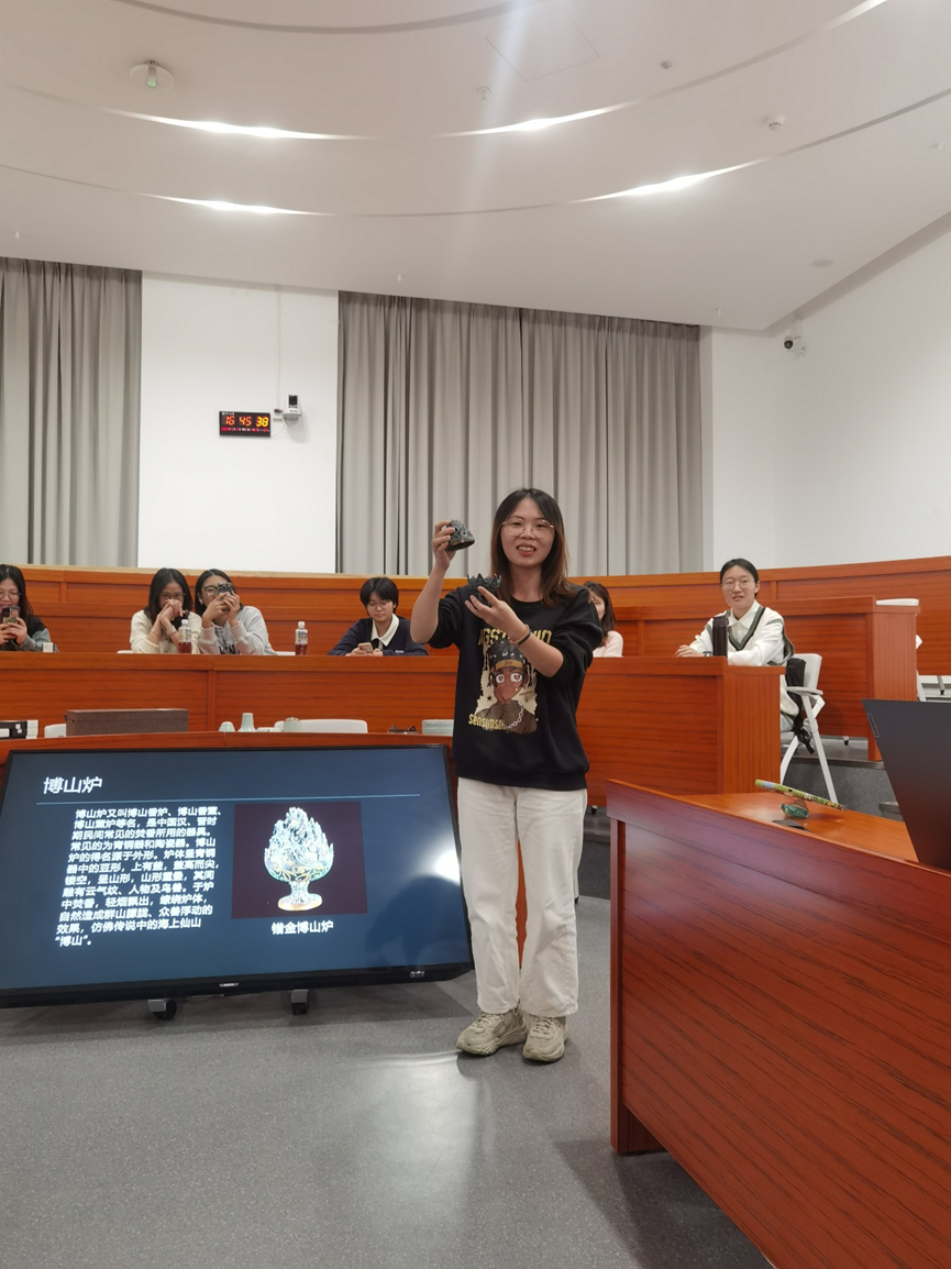 第一个互动交流环节,张老师和助理给师生们展示了特色鲜明的古代香具。从古人对香料的用法的思考出发,张雨老师将历史上出现的典型香具带到师生们面前,无论是香文化代表汉晋时期傅山炉、精巧的唐代鎏金双蛾纹银香囊,还是古朴的宋代三足瓷炉,都引起了师生们的极大兴趣。这一场跨越时空的交流,令师生们感叹古代香文化的神奇与珍贵同时,也对中国源远流长的农耕文化有了更深入思考和领悟。