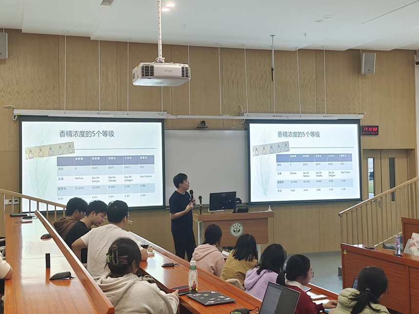 从香精、溶剂和辅助性成分的构成,到不同成分的作用和使用方式;从香水的“前中后调”,到香精浓度的五个等级;从香气产生的原因,再到香水的“四大香调”。张雨老师对香水进行了专业科普,也为同学们全面认识香水、合理选择香水提供了丰富的知识支撑和专业的指导建议。